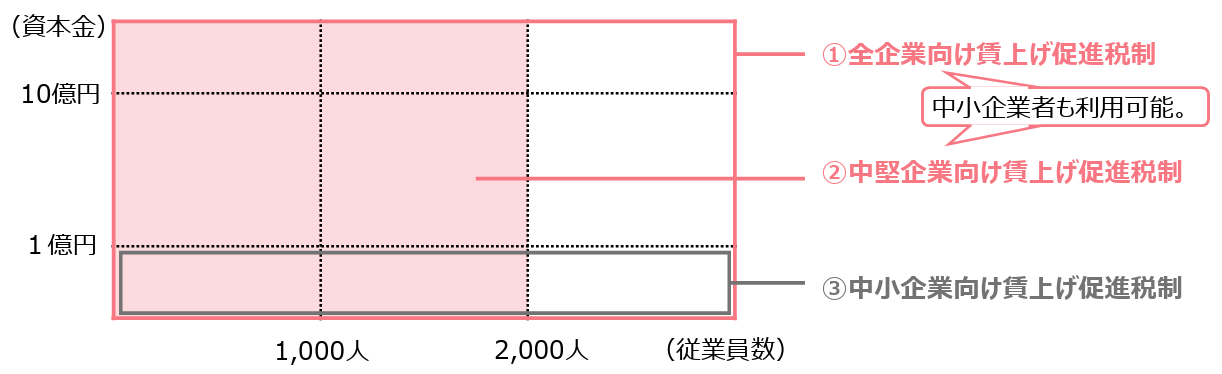 賃上げ促進税制は現状、大企業(全企業)向け税制、中堅企業向け税制、中小企業向け税制の3種類あり、法人にあっては適用事業年度終了の時、個人事業主にあっては適用を受ける年の12月31日における企業規模等に応じて、利用可能な税制が異なってきます。(併用は不可でいずれか1税制のみ選択適用となります。また業種・規模を問わず、企業・個人事業主は青色申告を行っていることが前提です。)