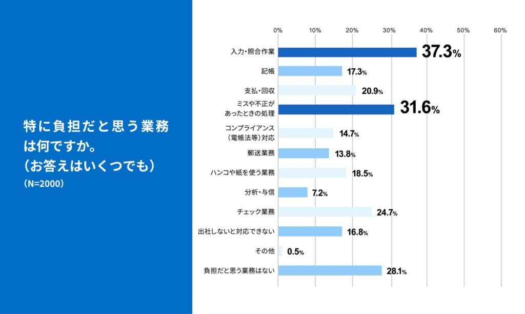 請求書業務において「入力・照合作業」が37.3%で最も負担が大きい工程として挙げられており、PDF化が進む中でも手作業を前提とした業務構造が維持されていることが示されました。