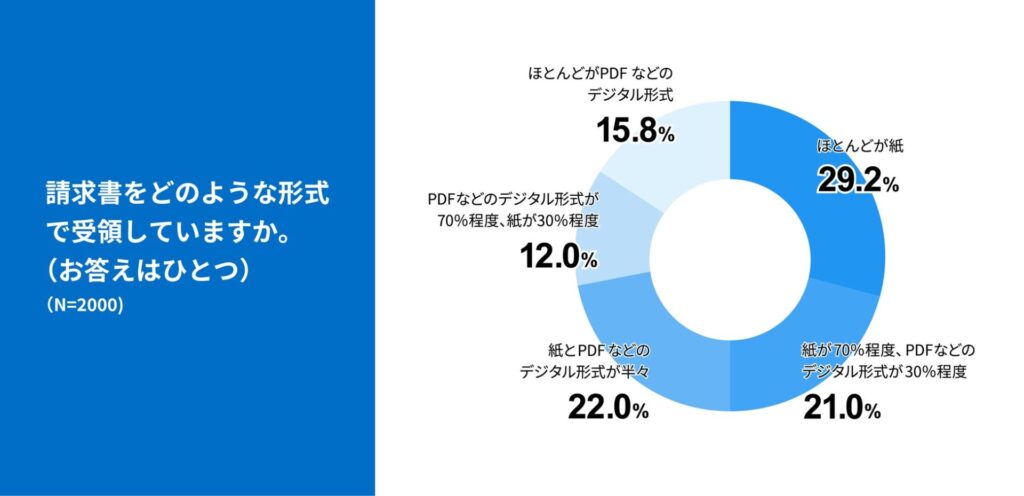 請求書の授受形式は、「ほとんどが紙」という企業は3割程度にとどまり、約7割はPDFやデータの形式を利用しています。