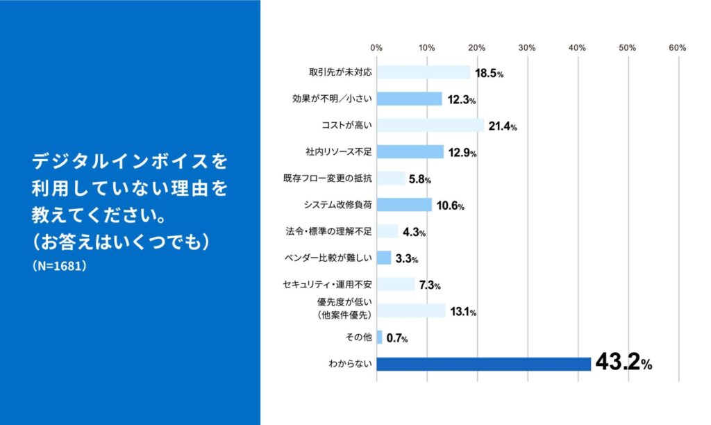 デジタルインボイスを導入している(本番運用、パイロット利用)は2割未満とまだ低い状況の中、そのうち約77%が導入効果を実感。一方で、未導入の理由として「取引先の未対応(18.5%)」が上位に挙がっており、個社だけでなく取引先を含めたエコシステム全体での推進が求められています。