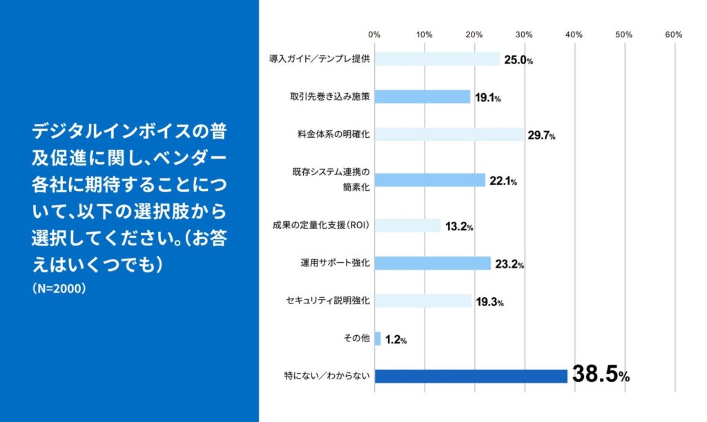 デジタルインボイスを利用していない理由として、「わからない」が最も多い中、コストやリソース不足に加え「取引先が未対応(18.5%)」が上位に挙がりました。また、ベンダーへの期待として「取引先巻き込み施策(19.1%)」や「導入ガイド提供(25.0%)」が求められています。一社単独ではなく、取引先と共通の仕組み(Peppol等)を利用することで相互にメリットが生まれる環境作りが急務です。