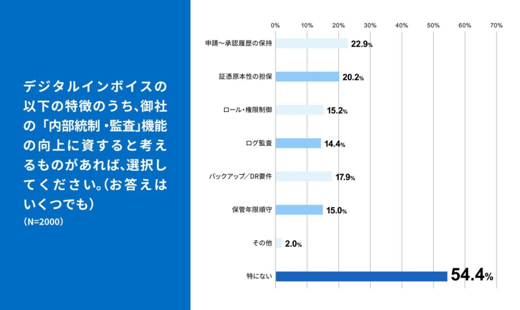 デジタルインボイスの特徴のうち自社の内部統制・監査機能の向上につながるものとして、「特になし」を除き「申請〜承認履歴の保持(22.9%)」や「証憑原本性の担保(20.2%)」などに期待が寄せられています。法対応やリモートワーク定着に伴い、守りのDXとしての側面も注目されています。